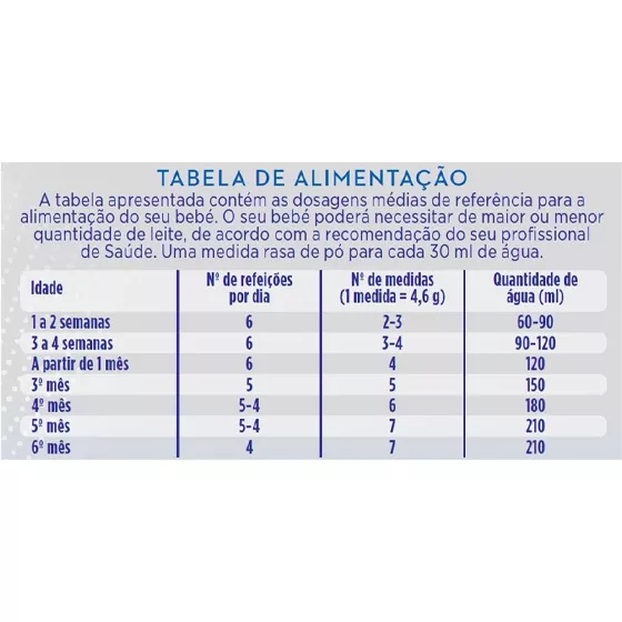 Antes de oferecer o leite ao bebé, verifique a temperatura testando algumas gotas no seu pulso (máx 37°C). Lave bem as mãos, utilize utensílios limpos e esterilizados e garanta que o topo da embalagem está limpo. Prepare o biberão e dê ao bebé no máximo nas 2 horas seguintes.