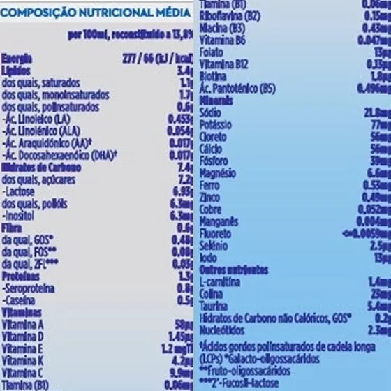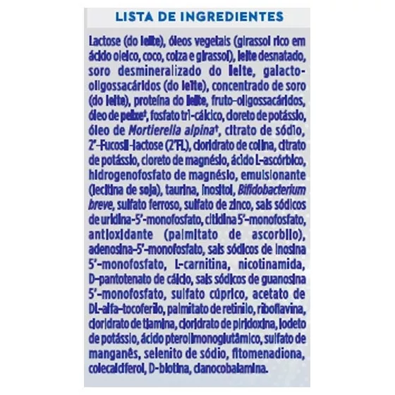 Lactose (do leite), óleos vegetais (girassol rico em ácido oleico, coco, colza e girassol), leite desnatado, soro desmineralizado do leite, galactooligossacáridos (do leite), concentrado de soro (do leite), proteína do leite, fruto-oligossacáridos, óleo de peixe†, fosfato tri-cálcico, cloreto de potássio, óleo de Mortierella alpina†, citrato de sódio, 2'-Fucosil-lactose (2'FL), cloridrato de colina, citrato de potássio, cloreto demagnésio, ácido L-ascórbico, hidrogenofosfato de magnésio, emulsionante (lecitina de soja), taurina, inositol, Bifidobacterium breve, sulfato ferroso, sulfato de zinco, sais sódicos de uridina-5'-monofosfato, citidina 5'-monofosfato, antioxidante (palmitato de ascorbilo), adenosina-5'-monofosfato, sais sódicos de inosina 5'-monofosfato, L-carnitina, nicotinamida, D-pantotenato de cálcio, sais sódicos de guanosina 5'-monofosfato, sulfato cúprico, acetato de DL-alfa-tocoferilo, palmitato de retinilo, riboflavina, cloridrato de tiamina, cloridrato de piridoxina, iodeto de potássio, ácido pteroilmonoglutâmico, sulfato de manganês, selenito de sódio, fitomenadiona, colecalciferol, D-biotina, cianocobalamina.