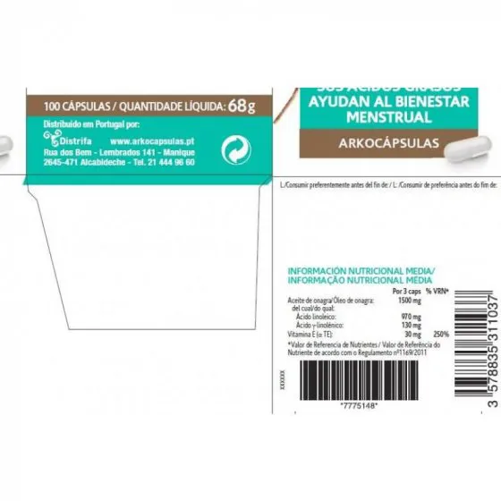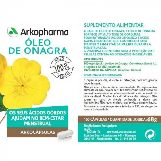 Arkocápsulas Óleo Onagra contém óleo de onagra que fornece um alto teor de gorduras polinsaturadas ácido linoleico e ácido gama-linolénico que contribuem para manter o bem-estar da mulher durante a menstruação.