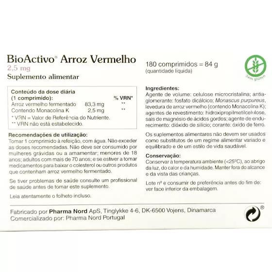 BioActivo Arroz Vermelho 2,5 mg são comprimidos que contêm 83,3 mg de levedura de arroz vermelho, com actividade documentada.