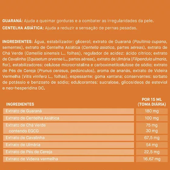 Água, estabilizador: glicerol; extrato de Guaraná (Paullinia cupana, sementes), extrato de Centelha Asiatica (Centella asiatico, partes aéreas), extrato de Chá Verde (Camellia sinensis L., folhas), regulador de acidez: ácido citrico; extrato de Cavalinha (Equisetum arvense L., partes aéreas), extrato de Ulmária (Filipendula ulmaria, flor), estabilizadores: celulose microcristalina e carboximetilcelulose de sódio, extrato de Pés de Cereja (Prunus cerasus, pedúnculos), aroma de ananás, extrato de Videira Vermelha (Vitis vinifera L., folhas), espessante: goma xantana; conservantes: sorbato de potássio e benzoato de sódio; edulcorantes: sucralose, glicosideos de esteviol e neo-hesperidina DC.