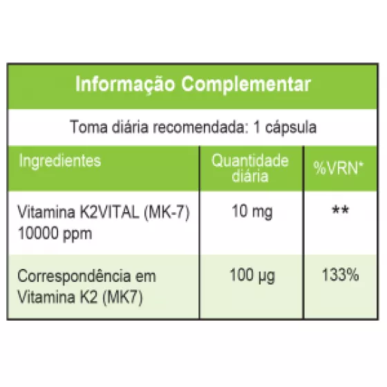 Agente de volume: maltodextrina de milho; agente de revestimento: Hidroxipropilmetilcelulose; Vitamina K2VITAL (Menaquinona-7) 10000 ppm vegan microencapsulada; Antiaglomerante: sais de magnésio de ácidos gordos de origem vegetal.