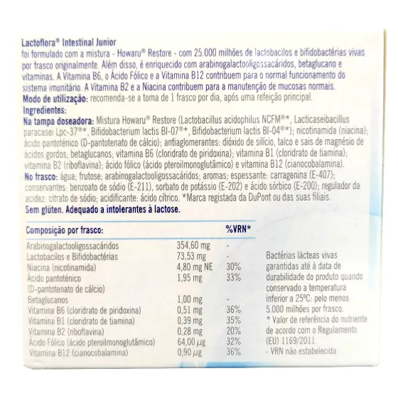 Lactoflora Intestinal Júnior é um simbiótico (mistura de probióticos e fibra prebiótica) com vitaminas e aloé vera.