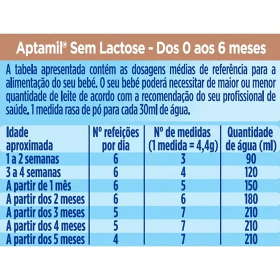 Aptamil Sem Lactose é um leite para lactentes destinado a fins nutricionais específicos (leite sem lactose) desde o nascimento, como substituto do leite materno, quando não amamentados.