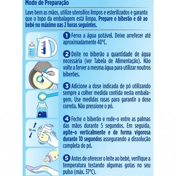 Lave bem as mãos, utilize utensílios limpos e esterilizados e garanta que o topo da embalagem está limpa. Prepare o biberão e dê ao bebé no máximo nas 2 horas seguintes.