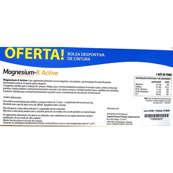 Magnesium-K Active é um suplemento que associa magnésio e potássio, desenvolvido a pensar em pessoas que praticam desporto de forma intensa e com maior desgaste e que, por isso, estão sujeitos a uma forte sudação e maior necessidade de produção de energia. Toma regular essencial como recuperação pós-treino e também na preparação da prática desportiva.