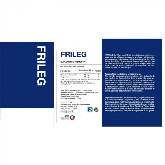 Frileg 90 Cápsulas suplemento alimentar contendo disosmina, gilbardeira e hesperidina.