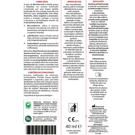 NeoFitoroid bioPomada é indicado no tratamento de hemorroidas (internas e externas) e dos sintomas associados às mesmas tais como dor, ardor e prurido anal e perianal. Pode ser utilizado também na presença de fissuras anais. NeoFitoroid bioPomada também pode ser útil na prevenção e em todas as situações que podem provocar irritação e/ou congestão da zona anal e perianal (obstipação, diarreia, alimentação e estilos de vida incorretos). NeoFitoroid bioPomada é adequado também durante a gravidez e a amamentação.