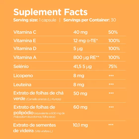 Suplemento alimentar com vitaminas C e E que contribuem para a proteção celular contra o dano oxidativo.