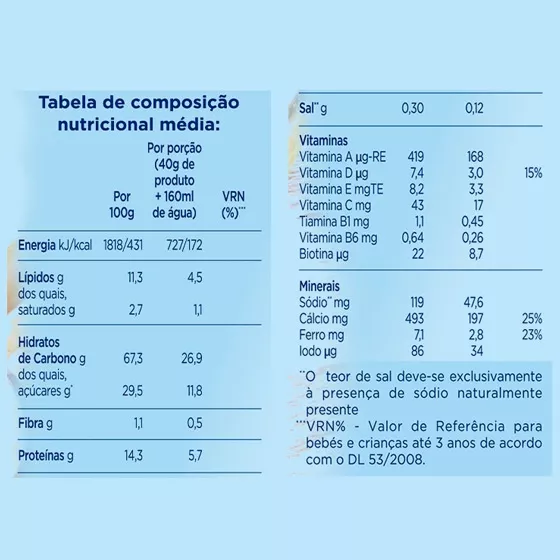 Deve ser consultado o profissional de saúde antes de iniciar a alimentação complementar, sempre de acordo com as características individuais do lactente. Não contém Glúten. Siga sempre as recomendações do profissional de saúde sobre a melhor alimentação para o bebé.