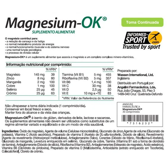 Tal como todos os suplementos alimentares, Magnesium-OK deve ser utilizado como complemento de um regime alimentar variado. Para otimização dos efeitos, Magnesium-OK deve ser tomado durante, pelo menos, 90 dias, não havendo limitação quanto à duração da toma deste suplemento alimentar.