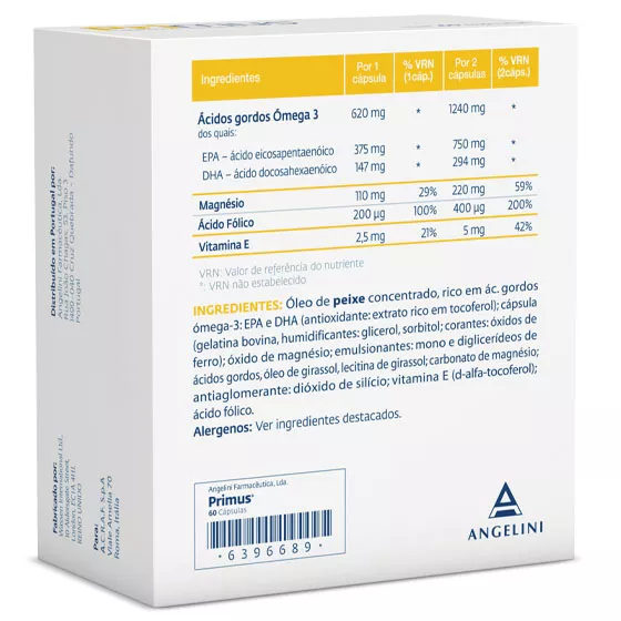 Cada cápsula contém uma mistura de óleo de peixe rico em ácidos gordos ómega-3 (DHA e EPA), vitamina E, magnésio e ácido fólico.