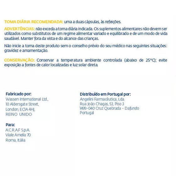 Não deve ser excedida a toma diária indicada. Os suplementos alimentares não devem ser utilizados como substitutos de um regime alimentar variado e equilibrado e de um modo de vida saudável. Manter fora do alcance das crianças. Não inicie a toma deste produto sem o conselho prévio do seu médico nas seguintes situações: gravidez, amamentação e anemia.