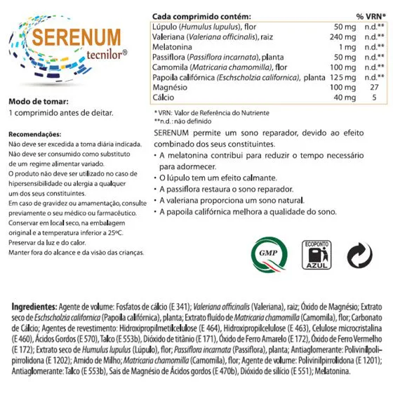 Serenum Tecnilor é um suplemento alimentar com Melatonina e cuja fórmula é ainda reforçada com plantas de uso tradicional, como a Passiflora, Valeriana, Lúpulo e Papoila-da-Califórnia.